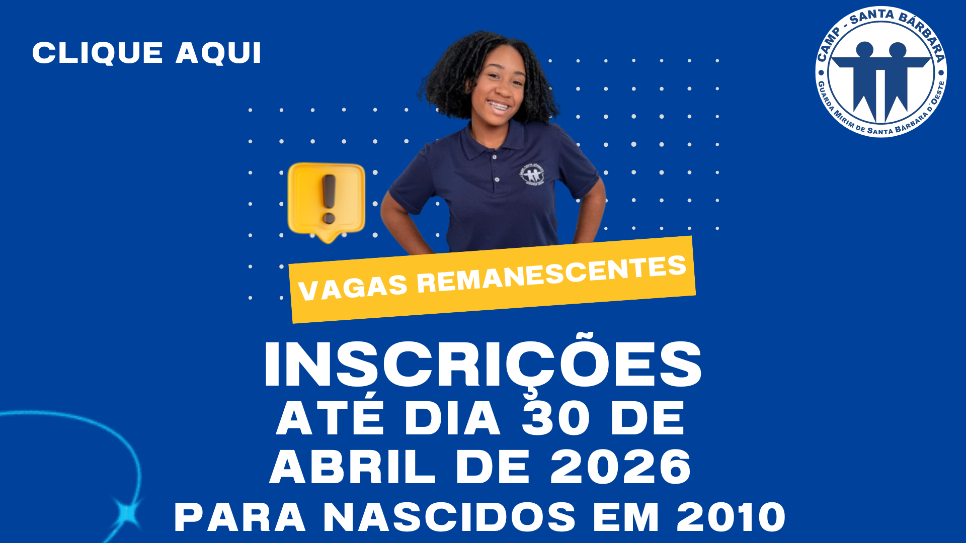 Para participar do Processo de Inscrições, é necessário preencher um formulário eletrônico disponibilizado durante o período de inscrições. As vagas são para os adolescentes que tenham ou completam 15 anos no ano da inscrição, que estejam cursando o 9º ano do Ensino Fundamental ou o 1º ano do Ensino Médio e residam na cidade de Santa Bárbara d' Oeste - SP.